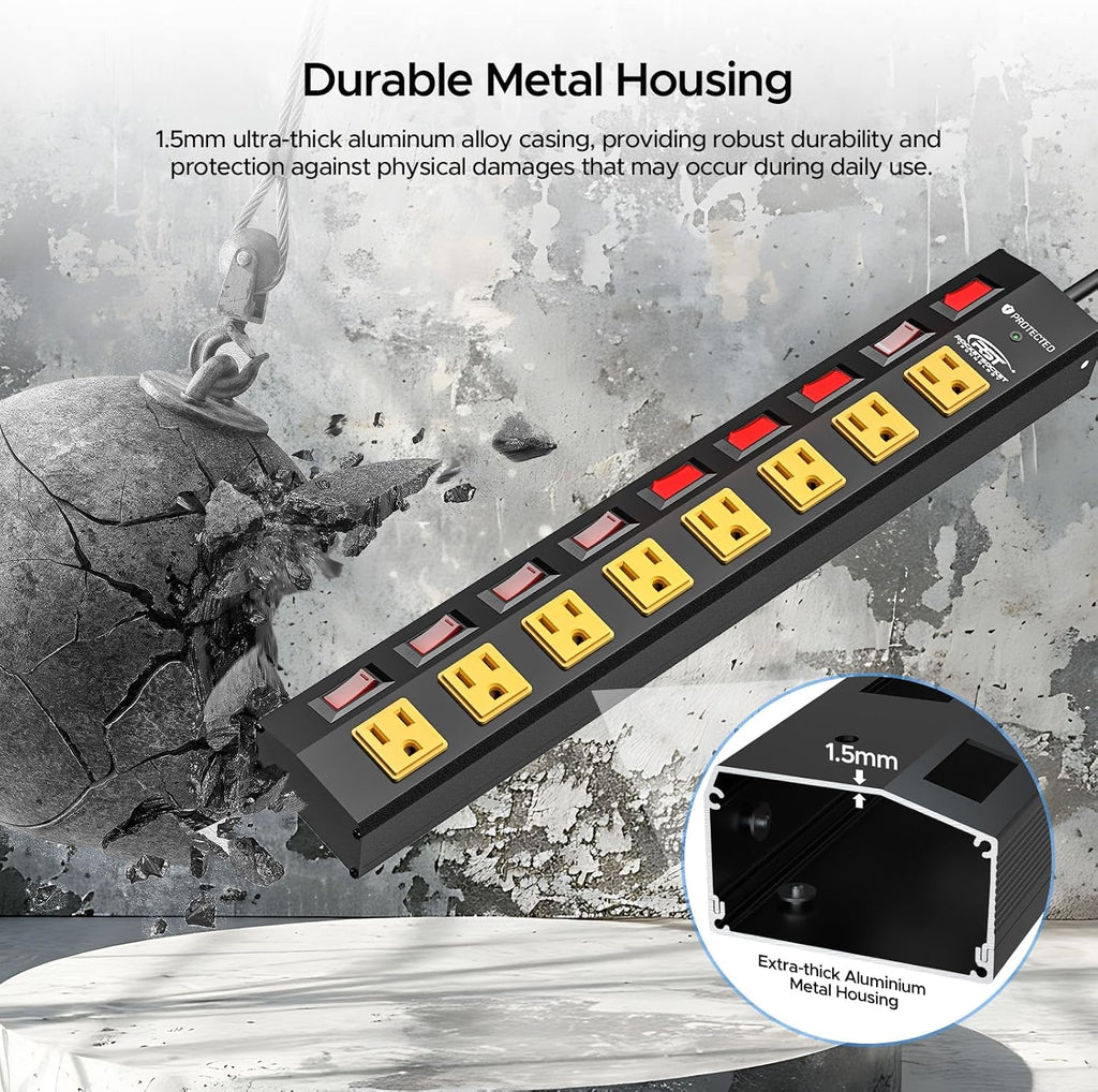 Crafted with a 1.5mm extra-thick aluminum alloy housing, this power strip is sturdy and durable. It's perfect for garages, workshops, offices, homes, and schools. The robust construction ensures long-lasting performance and reliability in various environments.